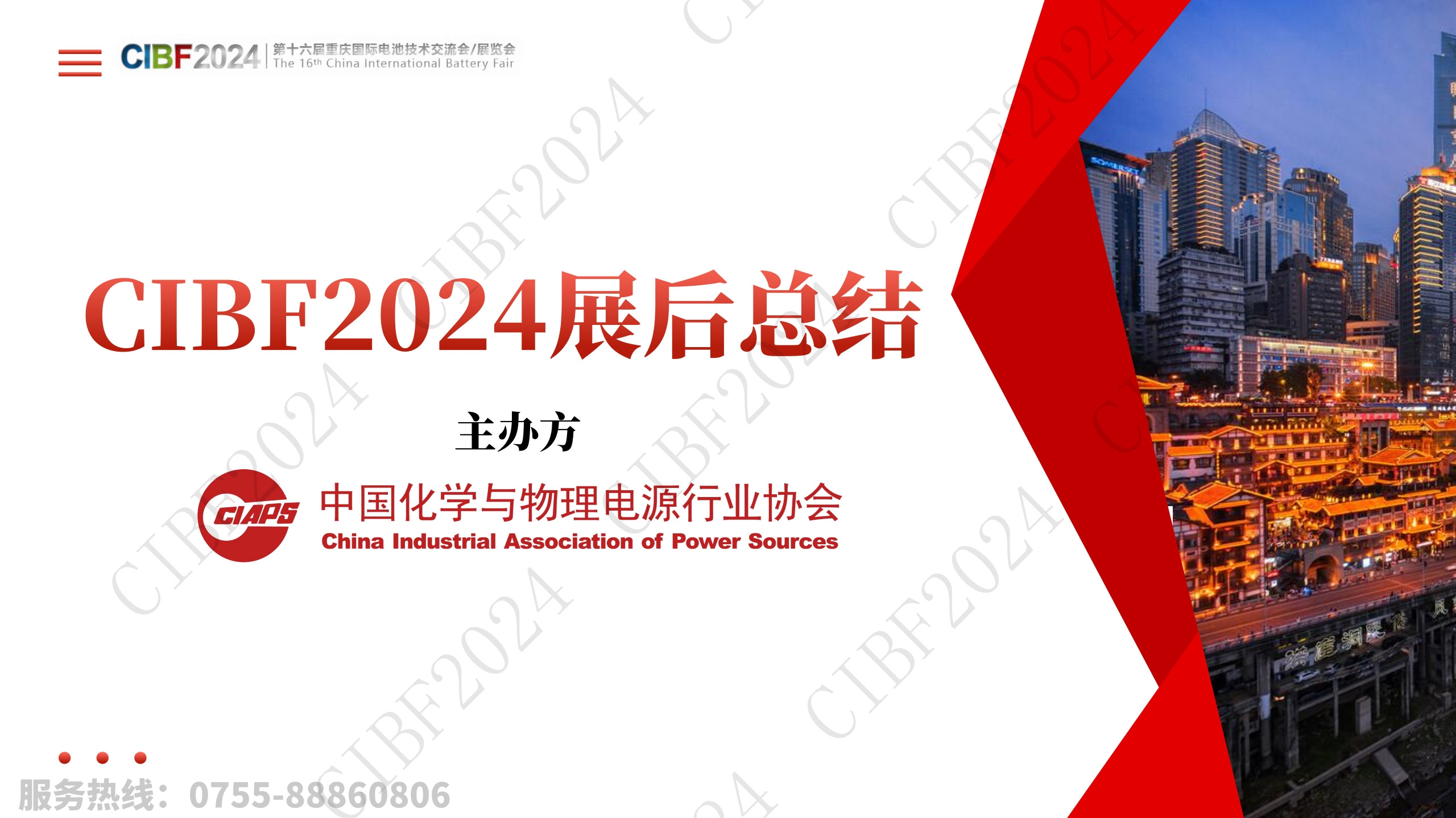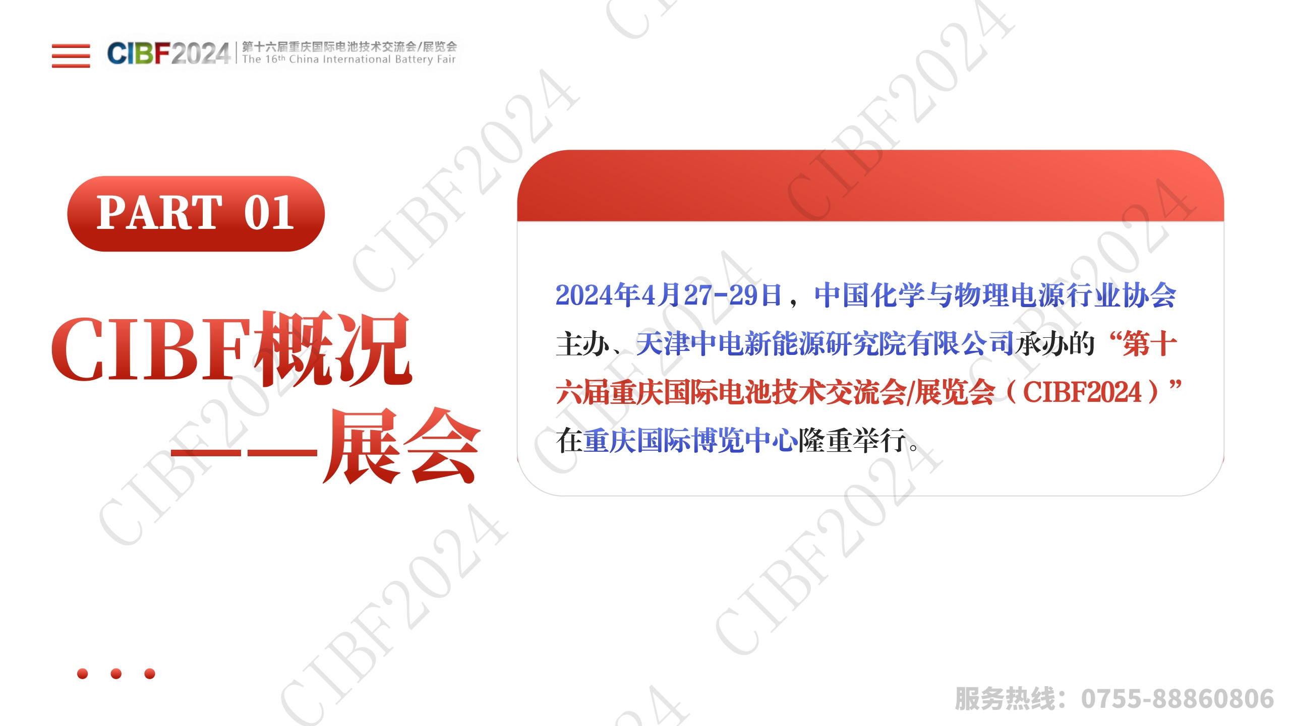 2024年4月27-29日,中国化学与物理电源行业协会主办、天津中电新能源研究院有限公司承办的“第十六届重庆国际电池技术交流会/展览会(CIBF2024)在重庆国际博览中心隆重举行。本届展会囊括14个展馆面积近19万平方米,涵盖了电池、材料、设备等全产业链以及海外产业特展,汇聚了行业龙头宁德时代、弗迪、先导智能、电科蓝天等2283家国内外参展商,参观观众近25万次.