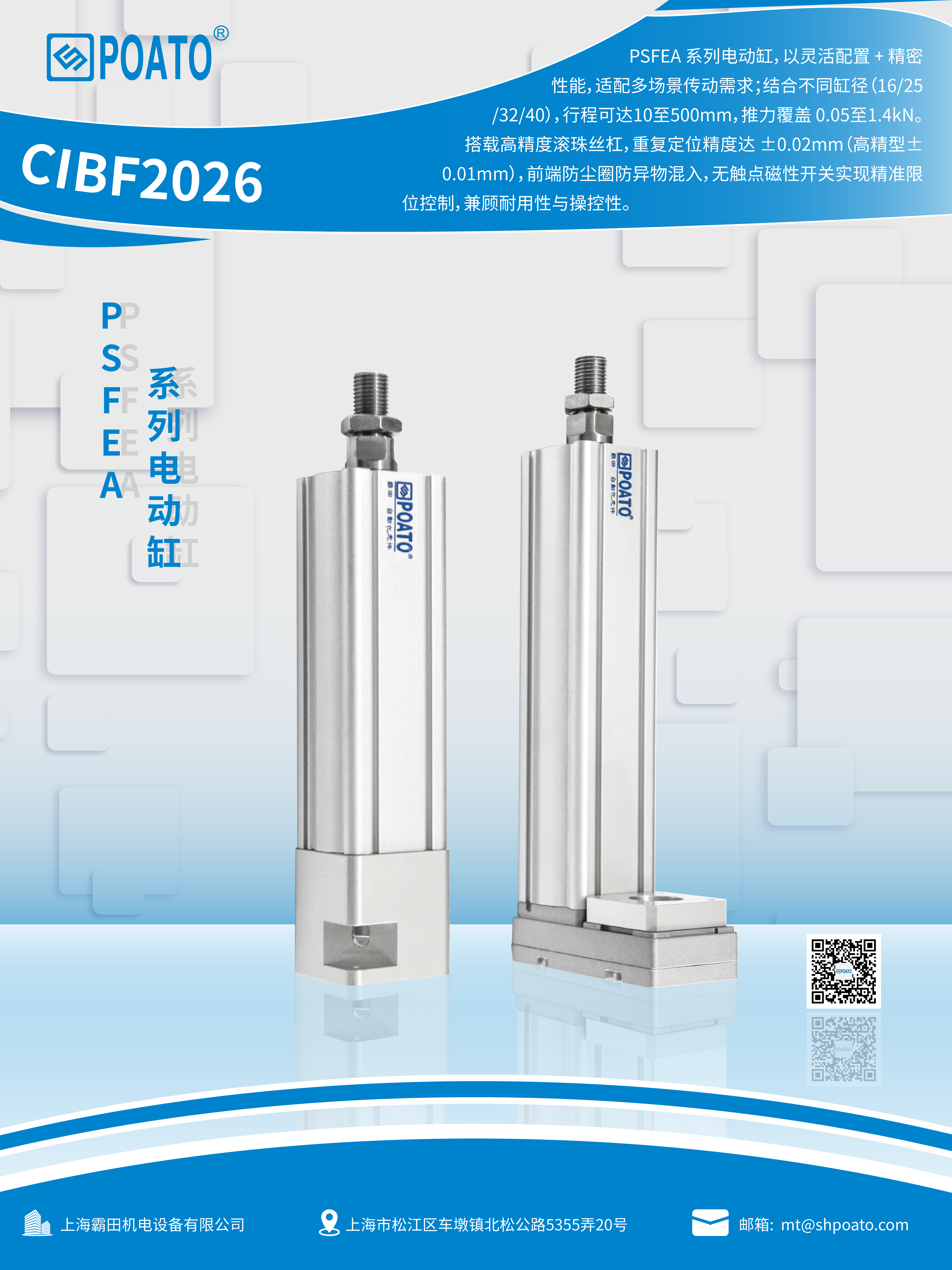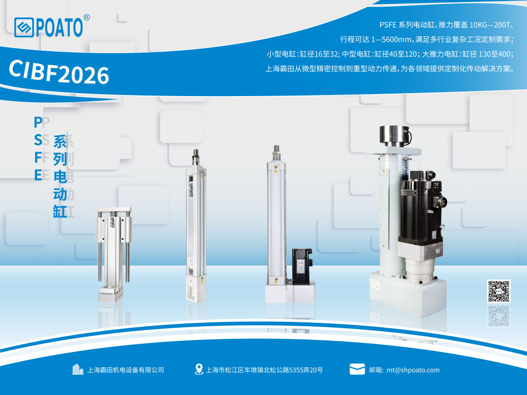 CIBF2026“链动全球・赋能绿色・驱动未来” 的主题,契合新能源产业精密制造升级方向,上海霸田深耕精密传动领域多年,对这场行业盛会满怀期许!2025年展会智能化生产趋势带来诸多启发,2026年我们将携核心产品矩阵亮相:PSFE系列电缸、PSFEA系列电缸、智能伺服压装系统及螺旋升降机等。我们期待以专业技术方案,链接全球电池与储能装备企业,助力产业高效绿色发展,共探行业合作新机遇!